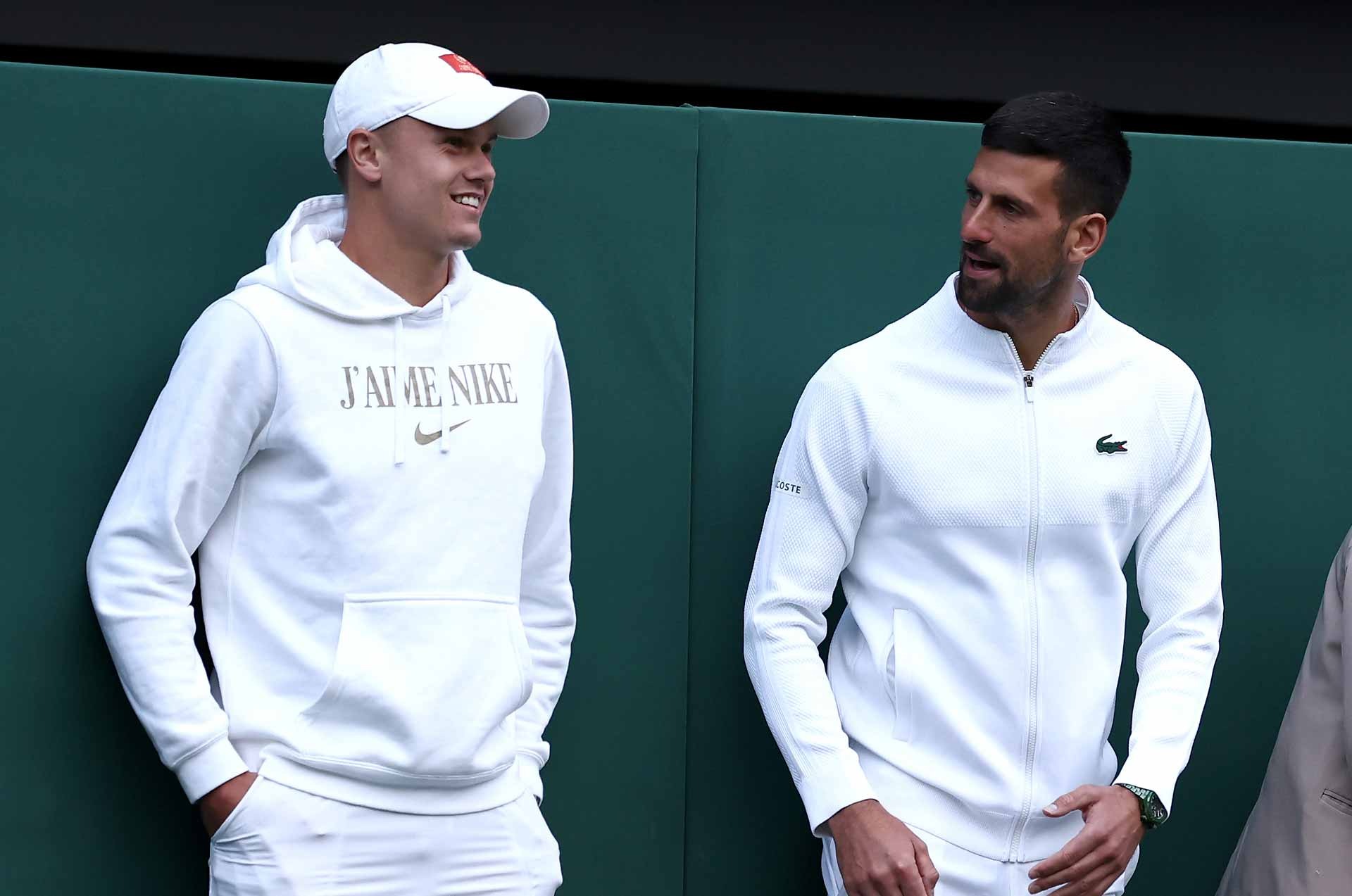 Djokovic (phải) và Rune trò chuyện trước thềm Wimbledon 2024. Ảnh: Reuters