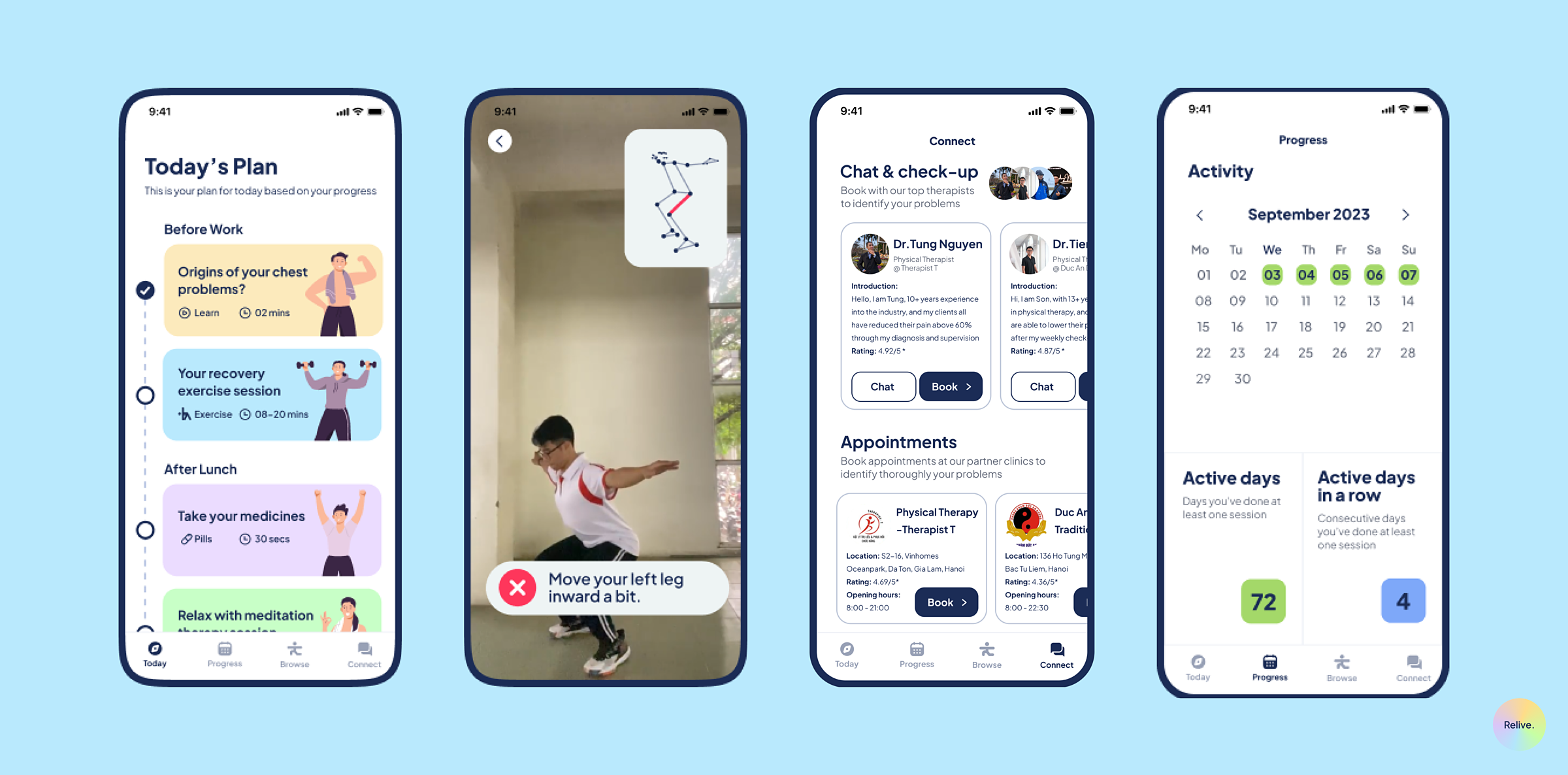 Relive là nền tảng y tế số di động (m-heath) hỗ trợ giám sát quá trình vật lý trị liệu và phục hồi chức năng của bệnh nhân mắc các vấn đề vận động. Nền tảng hoạt động dựa trên công nghệ thị giác máy tính và trí tuệ nhân tạo,cho phép ứng dụng ghi lại từng chuyển động của bệnh nhân thông qua camera điện thoại. Thông qua so sánh với những chuyển động đã chuẩn hóa của bài tập cung cấp bởi bác sĩ chuyên khoa y học thể thao,từ đó đưa ra cảnh báo,điều chỉnh theo thời gian thực nếu bệnh nhân làm sai động tác. Quá trình luyện tập của bệnh nhân đều được ghi,phân tích và tổng hợp thành một bản báo cáo,hỗ trợ bác sĩ đưa ra điều chỉnh phù hợp cho phác đồ điều trị của bệnh nhân.