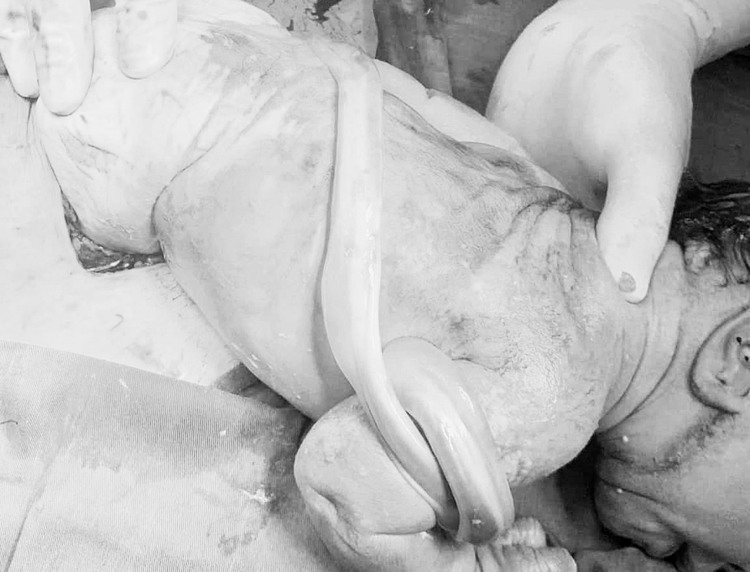 Sản phụ được mổ cấp cứu bắt con. Khi lấy em bé ra khỏi bụng mẹ,cả ê kíp rất bất ngờ thấy bé bị dây rốn thắt nút chặt ở tay và quấn quanh người. Các bác sĩ tháo xoắn cho em bé thoát khỏi nguy hiểm,may mắn bé gái an toàn,khỏe mạnh,nặng 2,9 kg.