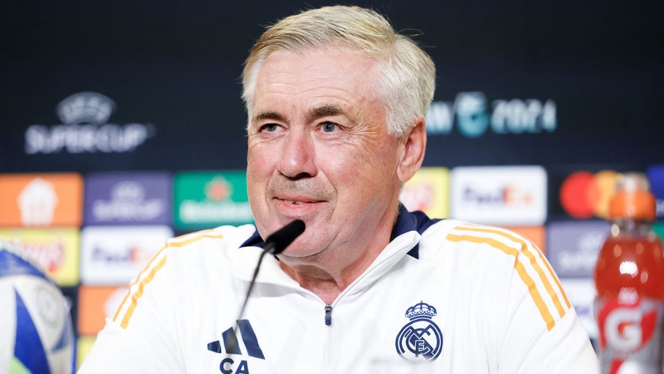 HLV Carlo Ancelotti trong buổi họp báo trước trận tranh Siêu Cup châu Âu giữa Real Madrid và Atalanta tại Warsaw ngày 14/8. Ảnh: Real Madrid FC.