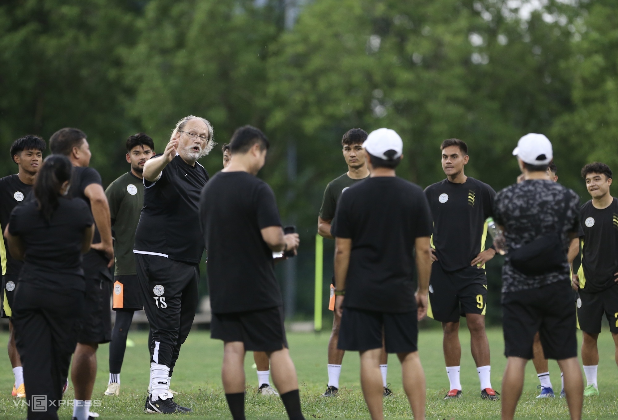 HLV Tom Saintfiet (trái) hướng dẫn cầu thủ đội tuyển Philippines tập luyện tại sân phụ Mỹ Đình,trước khi gặp Việt Nam ở vòng loại hai World Cup 2026 - khu vực châu Á,vào tháng 6/2024. Ảnh: Hiếu Lương