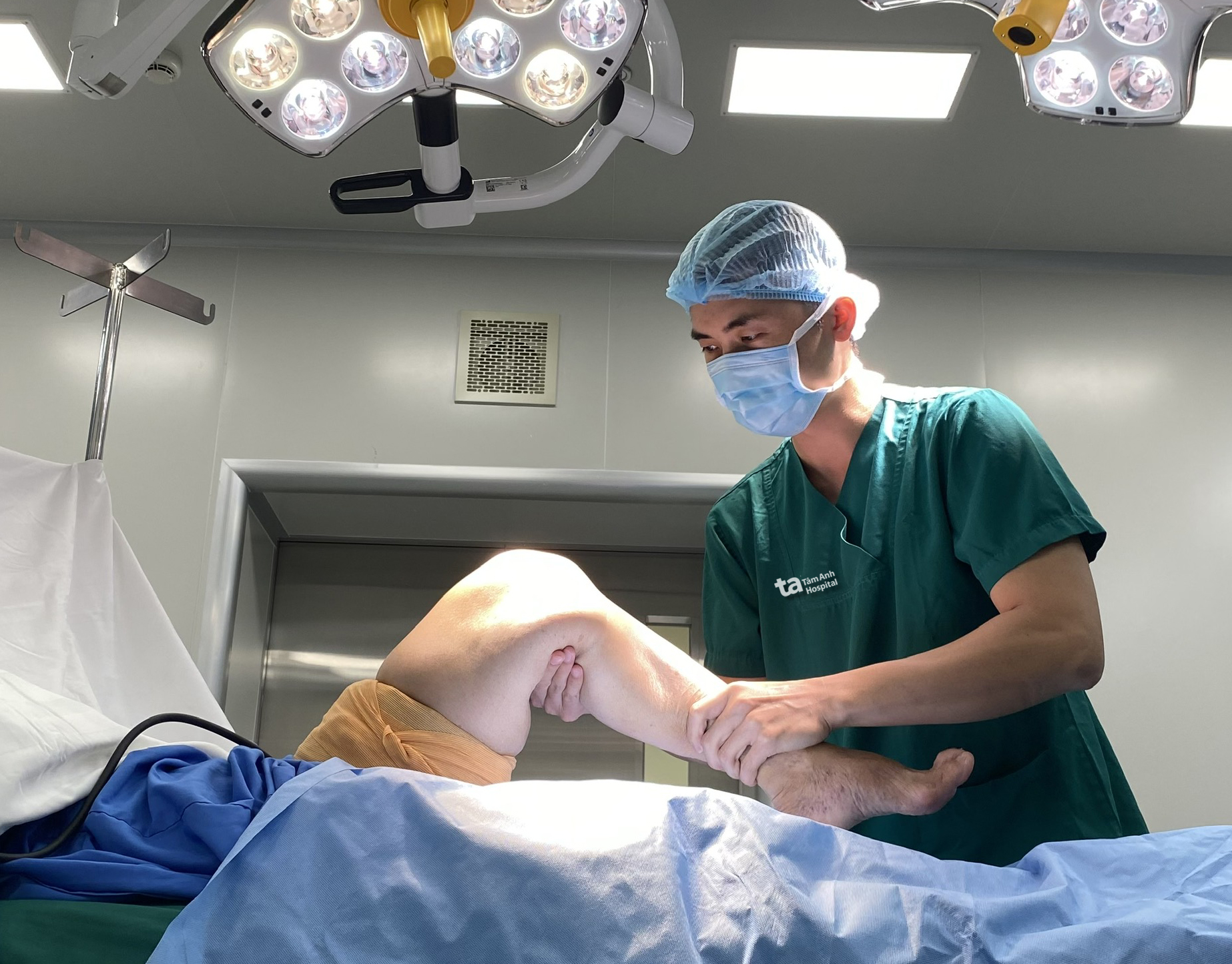 Bác sĩ Lưu chuẩn bị trước khi thay khớp gối cho bà Phước. Ảnh: Bệnh viện Đa khoa Tâm Anh