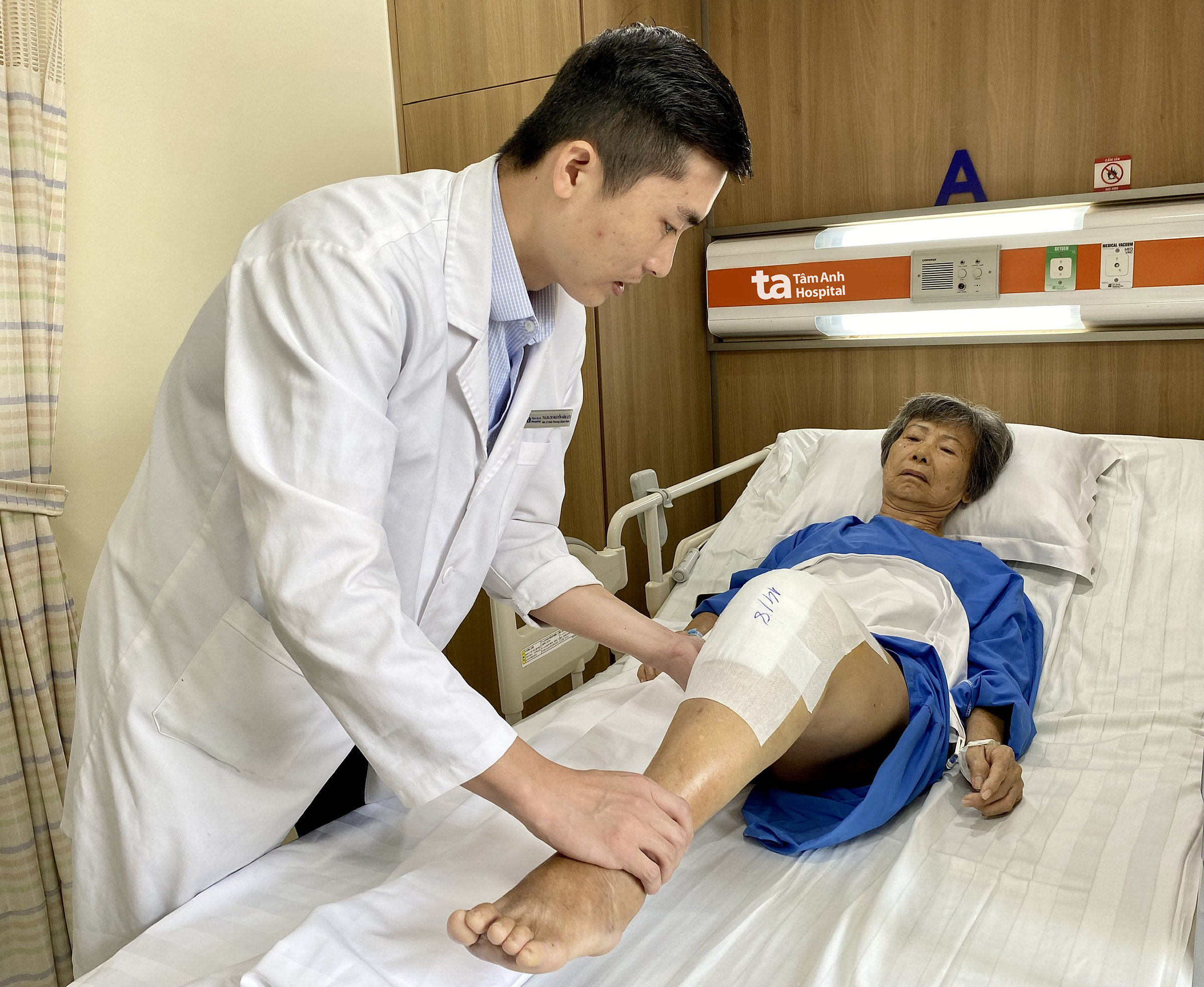 Bác sĩ Lưu kiểm tra tình trạng khớp gối người bệnh trước khi xuất viện. Ảnh: Bệnh viện Đa khoa Tâm Anh