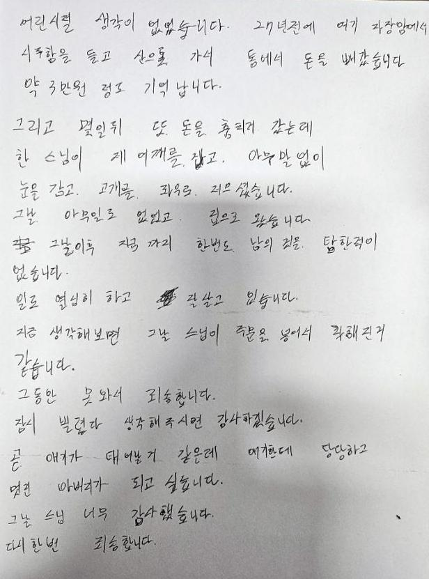 Trong thư,người ẩn danh thú nhận khi còn là một cậu bé đã ăn trộm tiền trong hòm từ thiện năm 1997. "Khi còn nhỏ tôi đã sai. Tôi lấy tiền từ thùng từ thiện,mang lên núi đếm được khoảng 30.000 won",người này mở đầu bức thư.