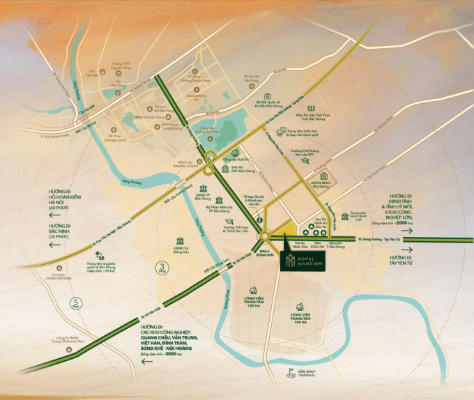 Khu đô thị Royal Mansion có quy mô khoảng 9,45 ha được hưởng nhiều lợi thế khi nằm kề cận ngã 6 Bắc Giang. Theo đại diện chủ đầu tư,dự án gồm một tòa khách sạn 5 sao,được quản lý vận hành bởi tập đoàn khách sạn lớn đến từ Mỹ,một tòa tháp văn phòng,4 tòa căn hộ cao cấp 29 tầng và 171 dinh thự thương mại theo phong cách kiến trúc Paris. Đi cùng khu đô thị,chủ đầu tư còn kiến tạo hệ thống tiện ích như: tuyến phố hàng hiệu,trung tâm hội nghị quốc tế sức chứa trên 2.000 chỗ ngồi,trung tâm thương mại quy mô lớn,hệ thống chăm sóc sức khỏe...