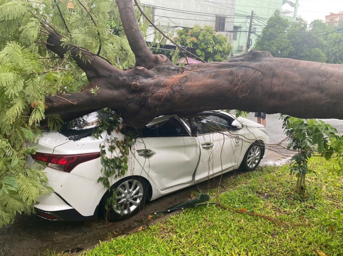 Cây phượng bật gốc đè ôtô. Ảnh: Minh Bằng