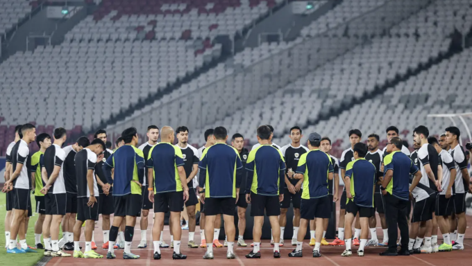 Indonesia họp đội ở buổi tập tại sân Gelora Bung Karno ngày 18/11. Ảnh: Bola
