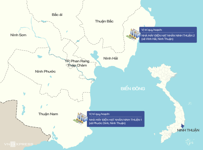 Hai vị trí được quy hoạch làm Nhà máy điện hạt nhân 1 và 2 ở Ninh Thuận. Đồ họa:Tiến Thành