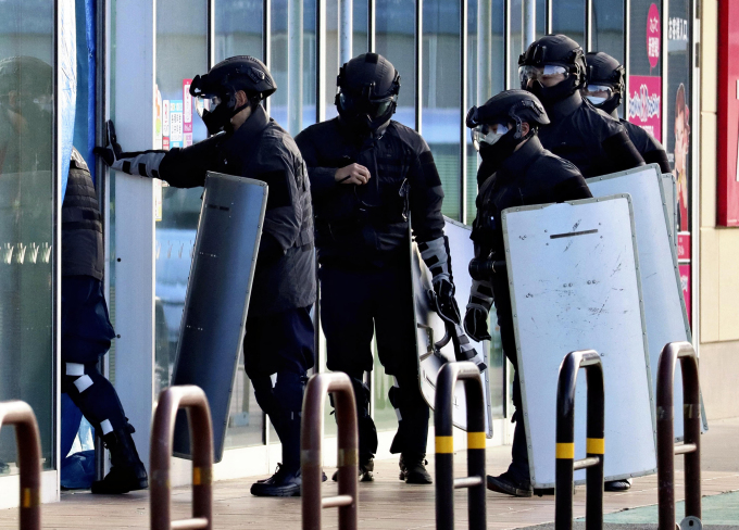 Cảnh sát mặc đồ bảo hộ chờ vây bắt gấu bên ngoài siêu thị thành phố Akita,Nhật Bản,ngày 2/12. Ảnh: AFP