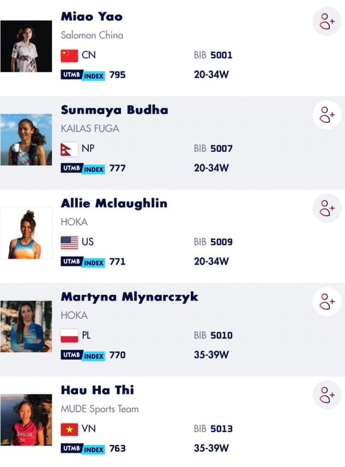 Sunmaya là á quân UTMB 2022 ở cự ly 100km - cự ly Hà Hậu đã tham dự hai năm và đều giành top bốn. Tháng 4 năm 2024,Sunmaya vô địch Wenling Golden Coast Trail Race 70km tại Trung Quốc. Mlynarczyk là á quân 100km UTMB năm nay,đánh bại chính Hà Hậu với thông số 12 giờ 11 phút 12 giây,chỉ sau Toni McCann.