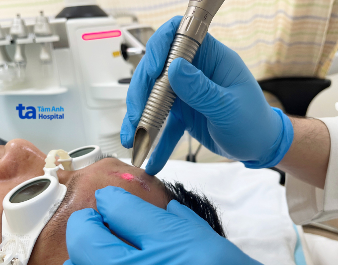 Người bệnh đang được laser tạo nhiệt vi điểm tăng sinh mô,liền lại da để điều trị sẹo lõm. Ảnh: Bệnh viện Đa khoa Tâm Anh