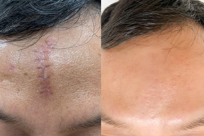 Sẹo lõm trên trán anh Chinh trước và sau điều trị bằng laser Fotona 4D. Ảnh: Bệnh viện Đa khoa Tâm Anh