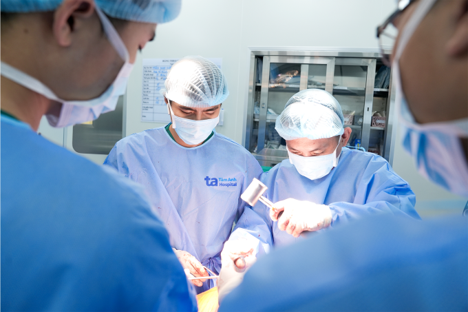 Bác sĩ Vũ (phải) thực hiện thay khớp háng cho người bệnh. Ảnh: Bệnh viện cung cấp