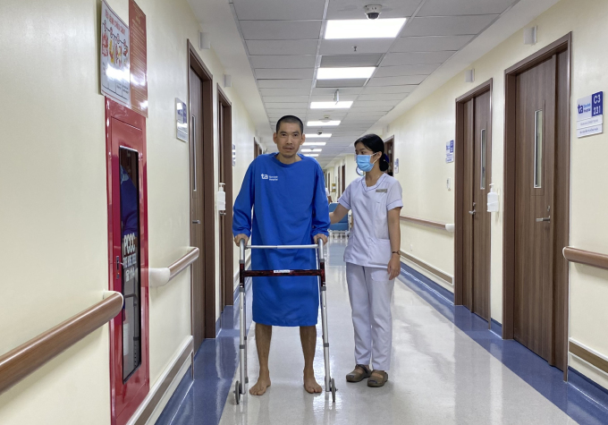 Anh Hoàng tập đi lại,chuẩn bị xuất viện sau ba ngày phẫu thuật. Ảnh: Bệnh viện cung cấp