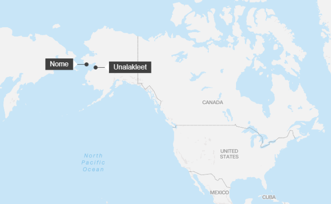 Vị trí giữa hai thành phố Unalakleet và Nome ở bang Alaska. Đồ họa: Mapbox