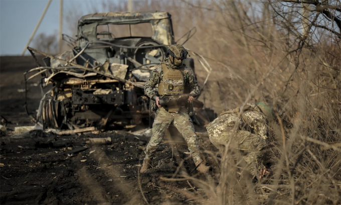 Binh sĩ Ukriane cạnh lô đạn pháo 155 mm tại tỉnh Donetsk tháng 4/2024. Ảnh: Reuters
