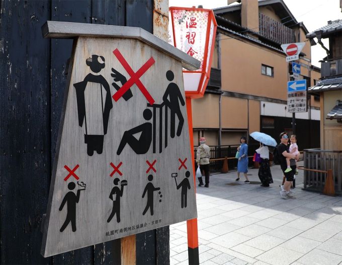 Biển cảnh báo những hành động xấu của du khách tại Kyoto. Ảnh: Jiji