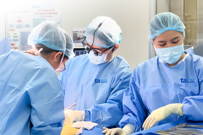Bác sĩ Dũng (giữa) cùng êkíp phẫu thuật bóc nội mạc động mạch cảnh cho bệnh nhân. Ảnh: Minh Huyền