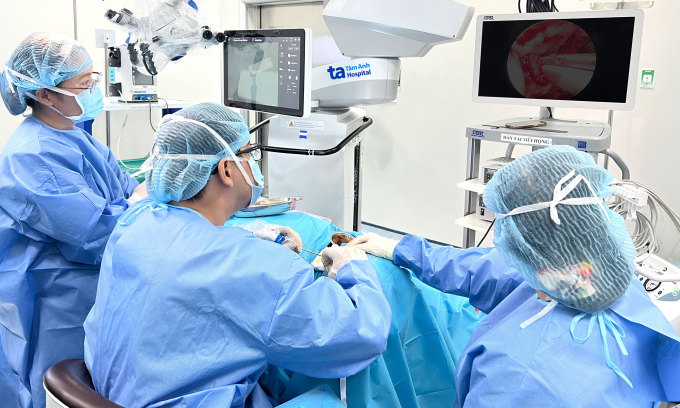 Bác sĩ Hằng (trái) và êkíp phẫu thuật tai xương chũm cho một người bệnh. Ảnh: Bệnh viện Đa khoa Tâm Anh
