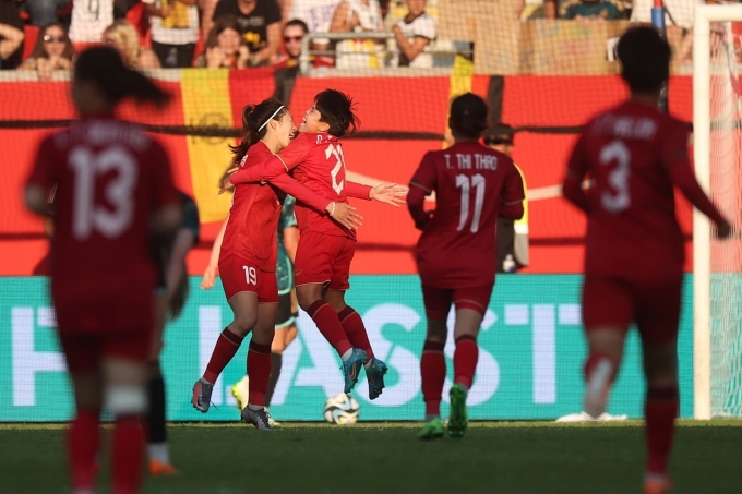 Cầu thủ mừng bàn thắng của Nguyễn Thanh Nhã (số 19) trong trận giao hữu Việt Nam thua Đức 1-2,tại sân Bieberer Berg vào ngày 25/6/2023. Ảnh: DFB
