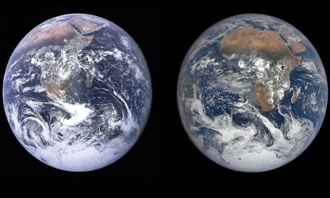 Bức ảnh Viên bi xanh (trái,năm 1972) và sau 50 năm (phải,năm 2022). Ảnh: NASA