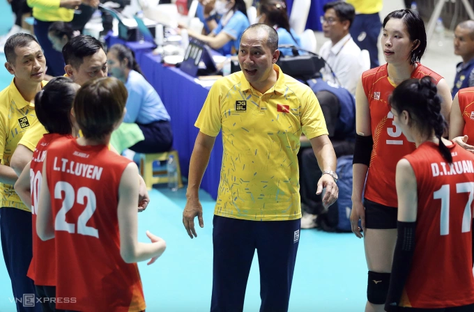 HLV Nguyễn Tuấn Kiệt (áo vàng giữa) chỉ đạo trong trận Việt Nam thắng Indonesia 3-2 ở bán kết bóng chuyền nữ SEA Games 32,tại Campuchia ngày 13/5/2023. Ảnh: Đức Đồng