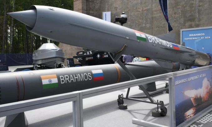 Tên lửa siêu thanh BrahMos trưng bày tại triển lãm quốc phòng ở ngoại ô St. Petersburg,Nga tháng 6/2024. Ảnh: Sputnik