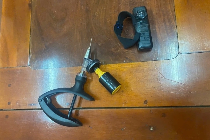 Tối 24/5,kiểm tra Thông đi xe máy trên đường,cảnh sát thu ống chứa dung dịch màu xanh; một kim tiêm có chứa dung dịch màu xanh; một camera giấu kín loại mang trên tay.