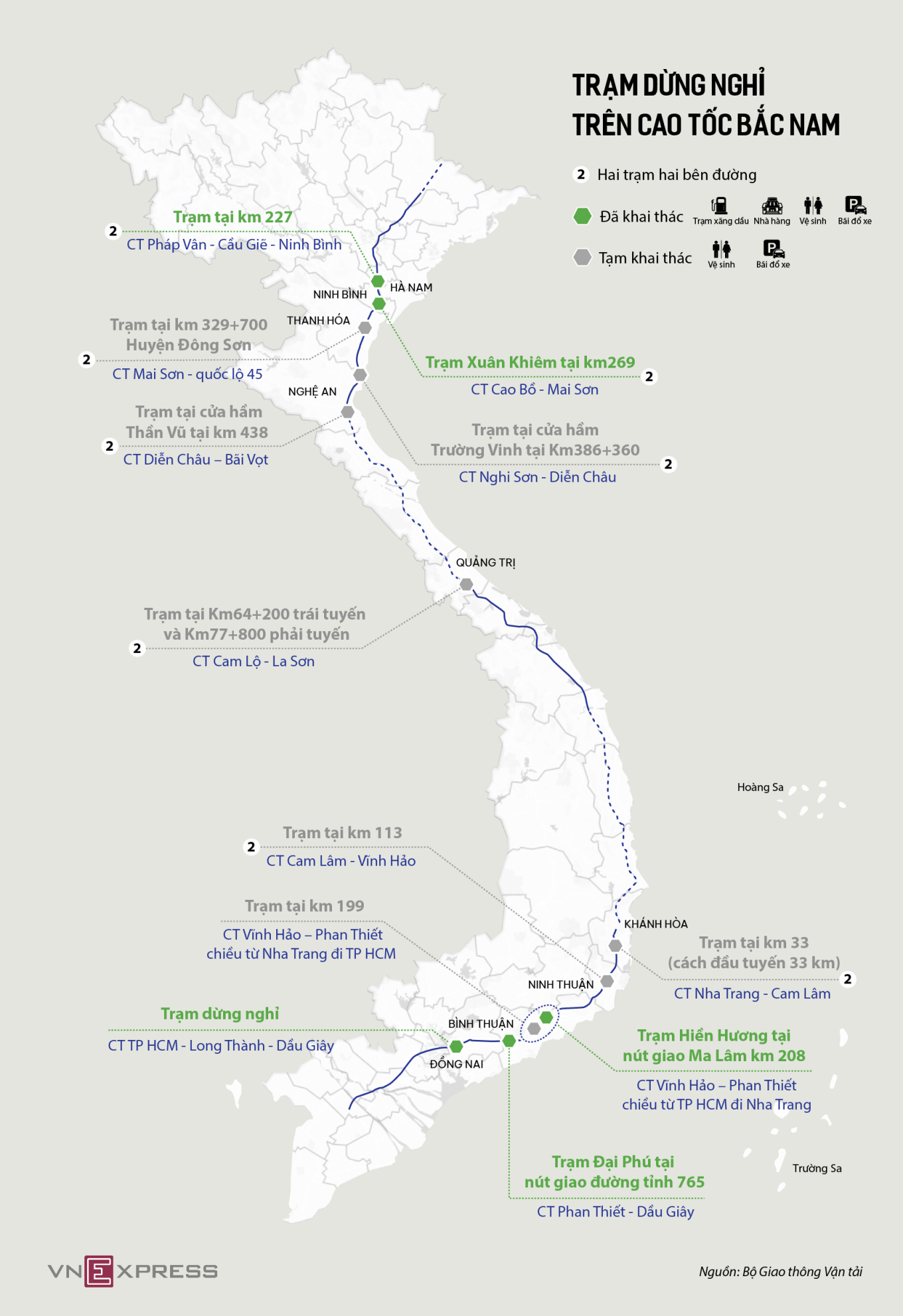 Trong khi chờ các trạm dừng theo quy hoạch được đầu tư,Bộ Giao thông Vận tải bố trí 7 trạm dừng nghỉ tạm trên trục cao tốc này phục vụ người dân.