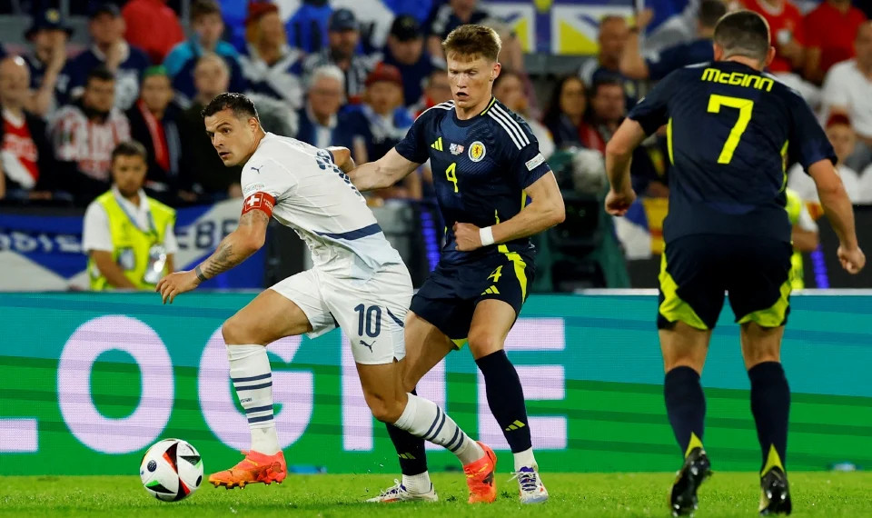 Đội trưởng Granit Xhaka (trái) trong trận Thụy Sĩ hòa Scotland 1-1 trên sân Cologne,Đức,lượt hai bảng A Euro tối 19/6/2024. Ảnh: Reuters