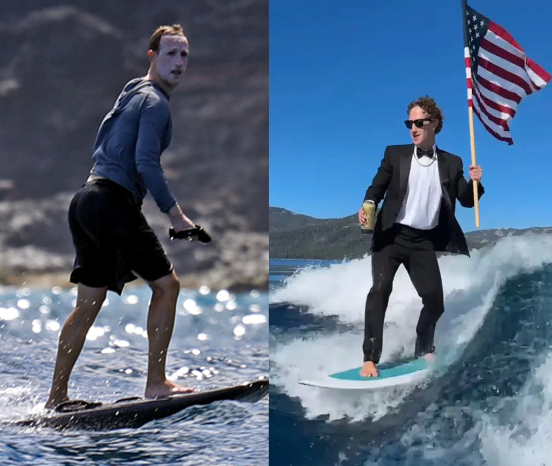 Thay đổi trong phong cách của Mark Zuckerberg khi đi lướt sóng năm 2020 (trái) và bốn năm sau. Nguồn: Mark Zuckerberg