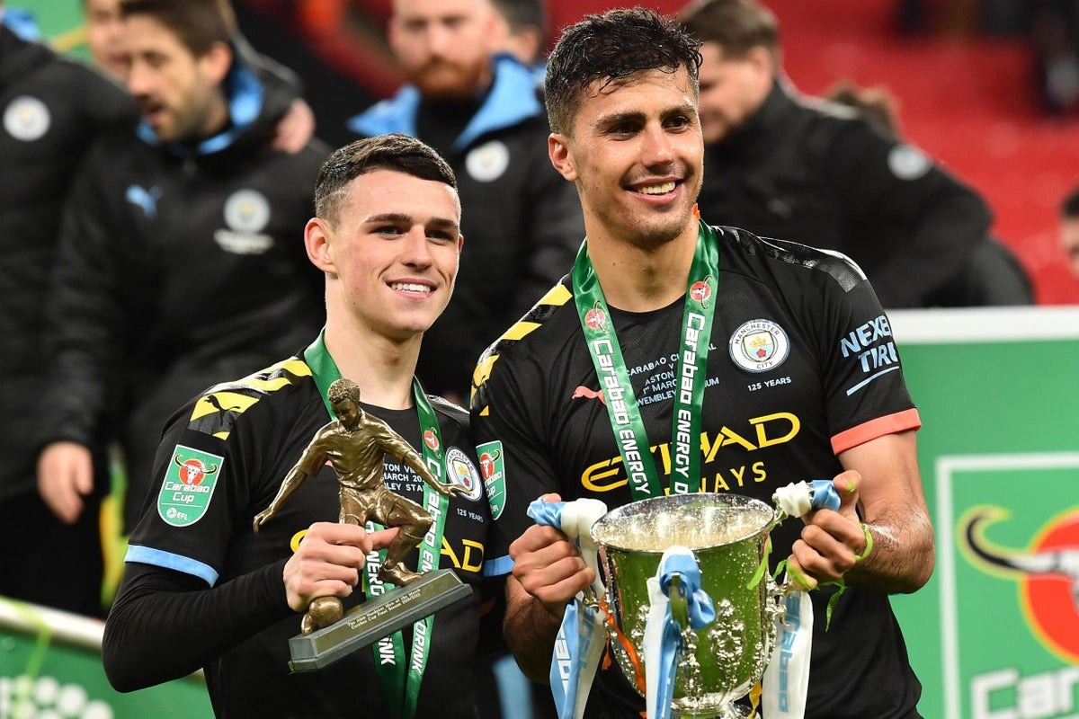 Rodri (phải) và Foden trong màu áo Man City. Ảnh: AFP