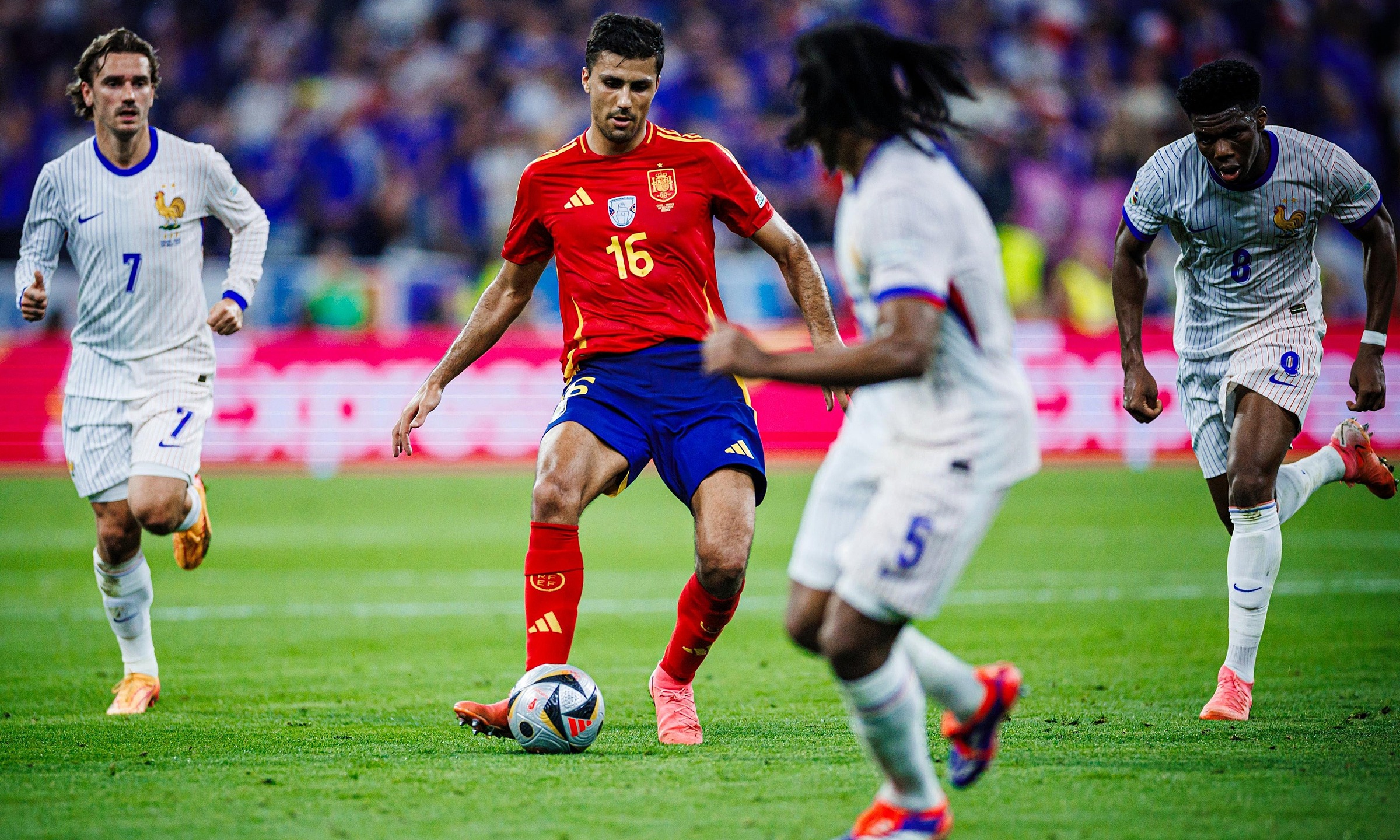 Rodri cầm bóng trong trận Tây Ban Nha thắng Pháp ở bán kết Euro 2024. Ảnh: RFEF