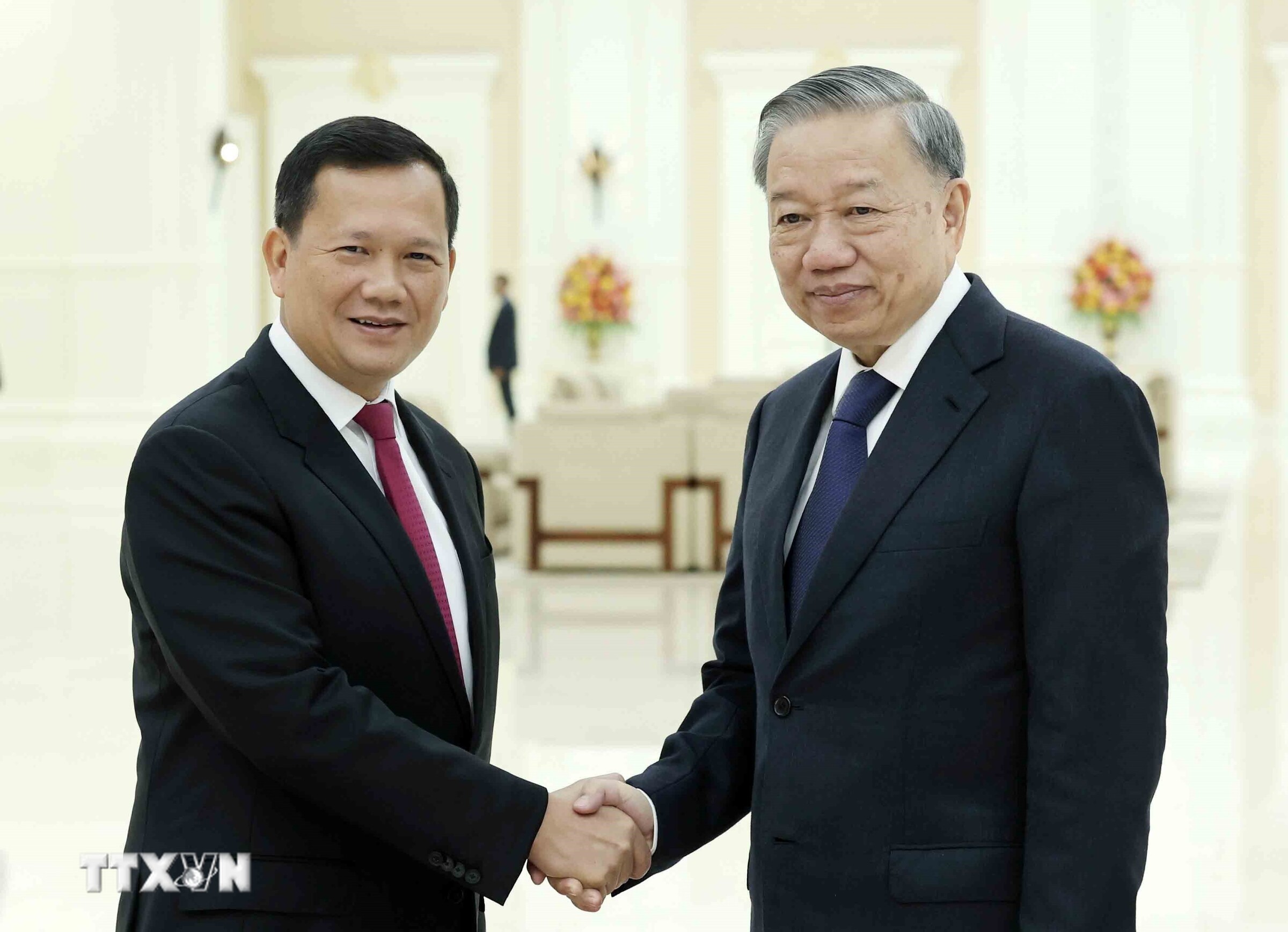 Chủ tịch nước Tô Lâm và Thủ tướng Campuchia Hun Manet sáng 13/7. Ảnh: TTXVN