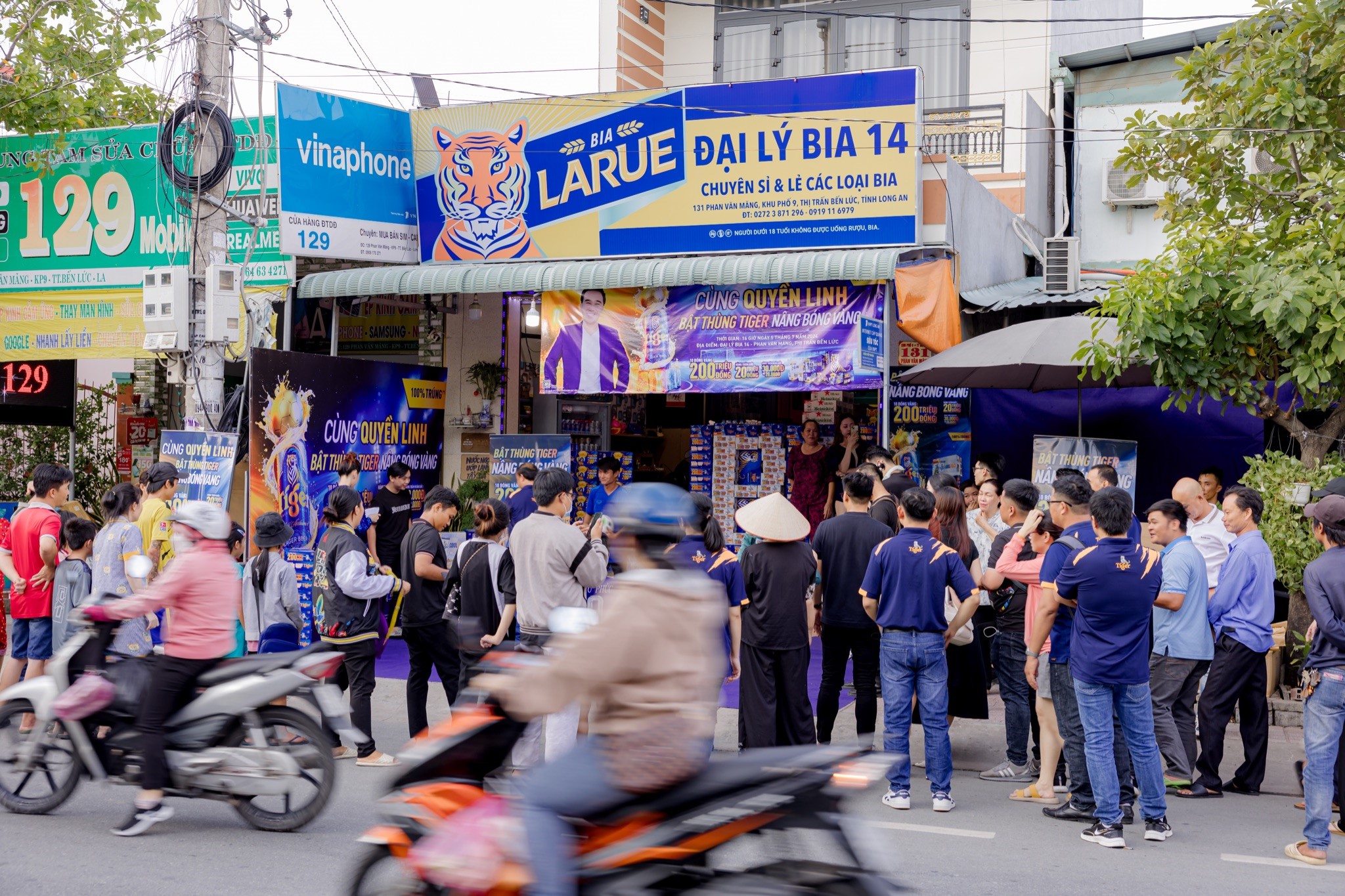Người dân xếp hàng giao lưu cùng Quyền Linh tại một điểm bán hàng ở Bến Lức,Long An. Ảnh: Tiger Beer