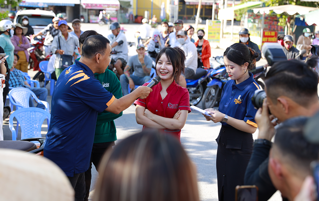 Người dân tham gia phần thi hỏi đáp mang tên ‘Nhanh như cọp’ với thời gian 90 giây cùng Quyền Linh,nội dung xoay quanh chương trình khuyến mại "Bật thùng Tiger - Nâng bóng vàng". Ảnh: Tiger Beer