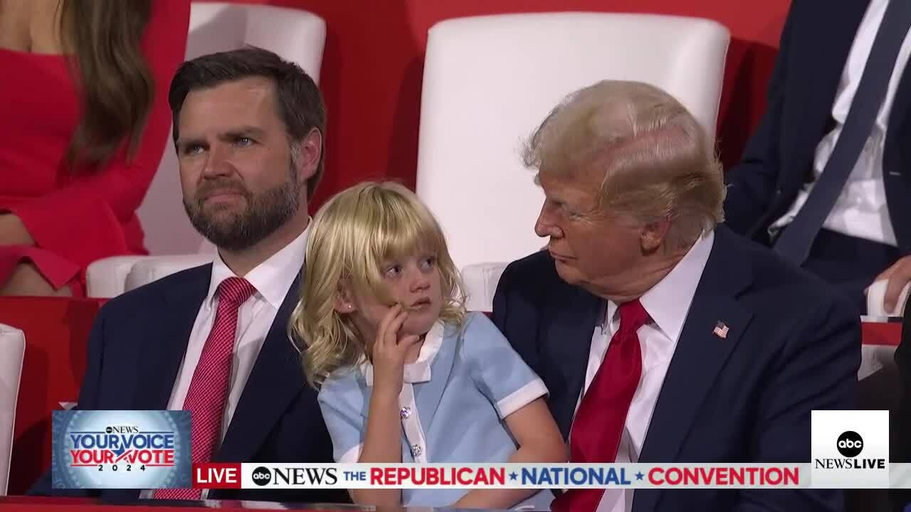 Cựu tổng thống Mỹ Donald Trump bế cháu gái Carolina trong lúc con trai Eric phát biểu tại đại hội đảng Cộng hòa ở Milwaukee,bang Wisconsin tối 18/7. Video: ABC