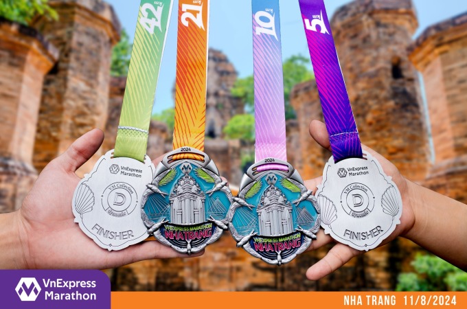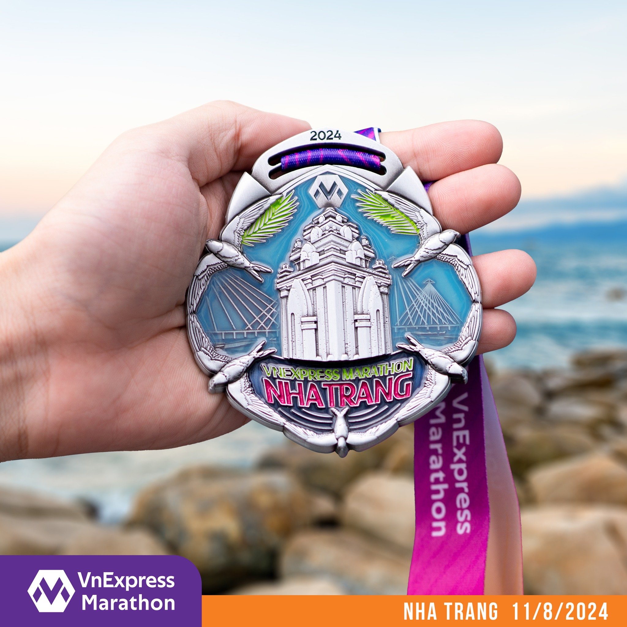 Thiên nhiên,văn hóa,lịch sử Nha Trang tiếp tục trở thành nguồn cảm hứng cho các thiết kế của VnExpress Marathon mùa thứ ba. Với huy chương,phần khung được cách điệu từ hình ảnh con thoi - tượng trưng cho thành phố Nha Trang được bao bọc bởi biển cả và núi rừng.