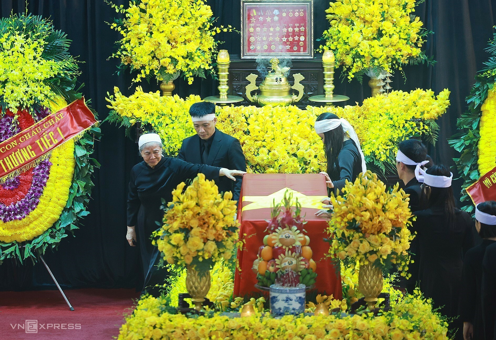 Phu nhân Ngô Thị Mận,con trai Nguyễn Trọng Trường và người thân đi vòng quanh linh cữu Tổng Bí thư lần cuối. Ảnh: Giang Huy