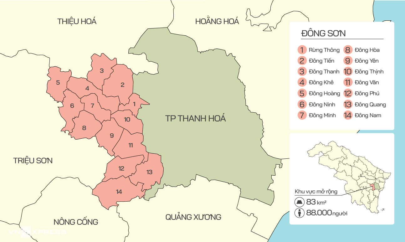 Kế hoạch sáp nhập huyện Đông Sơn vào TP Thanh Hóa dự kiến thực hiện tháng 7/2023 song phải lùi lại do vướng mắc một số thủ tục hành chính. Theo dự thảo đề án đang được trình các bộ ngành trung ương,toàn bộ gần 83 km2,dân số hơn 101.000 ở 14 xã,thị trấn của huyện Đông Sơn sẽ nhập vào TP Thanh Hóa.