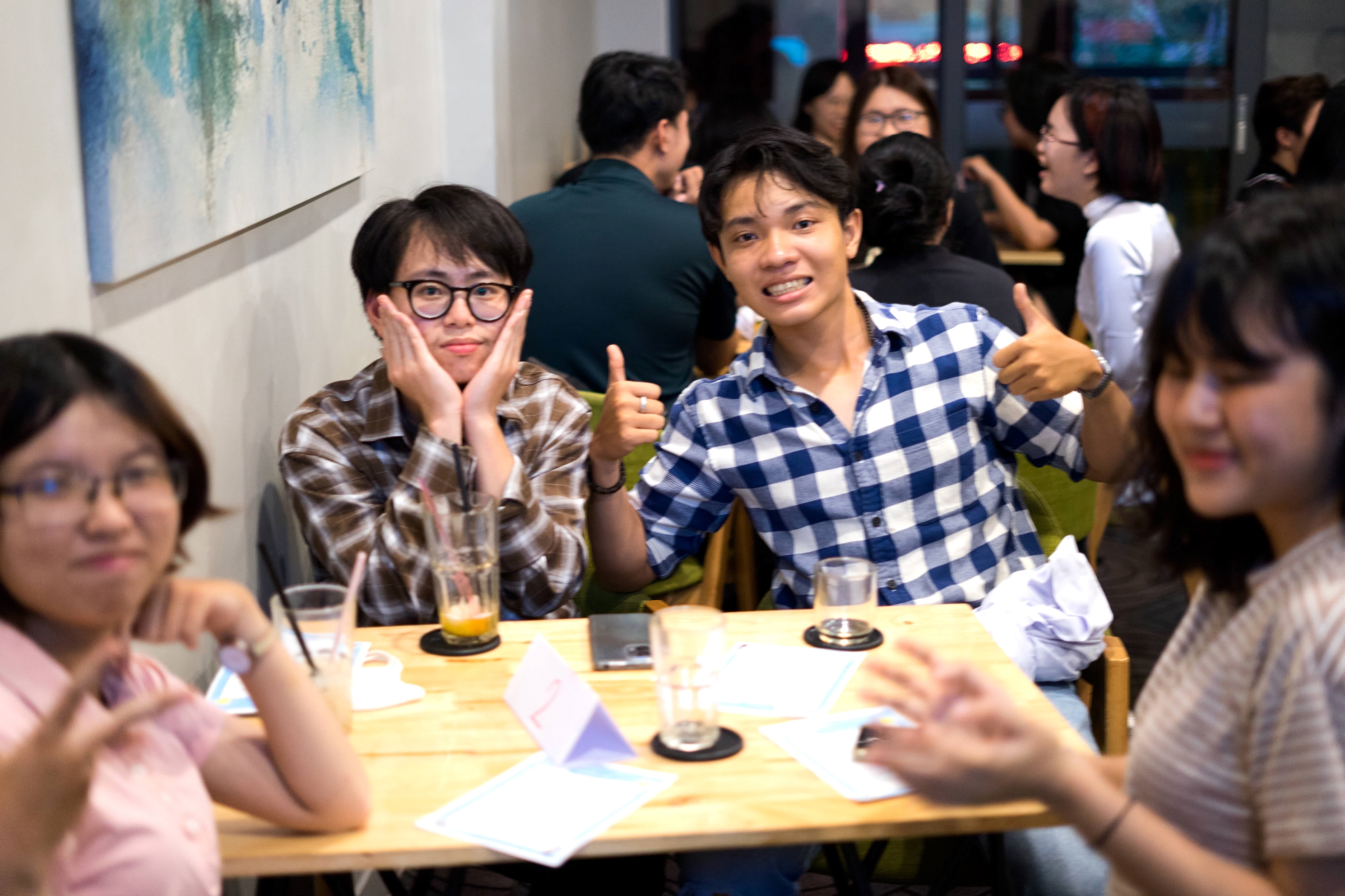 Thái (áo kẻ xanh) trong buổi thảo luận chủ đề du lịch ở câu lạc bộ tiếng Anh. Ảnh: Nhân vật cung cấp