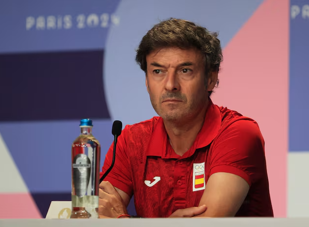 HLV Olympic Tây Ban Nha,Santi Denia trong buổi họp báo tại Trung tâm báo chí chính,Paris,Pháp ngày 8/8. Ảnh: Reuters.