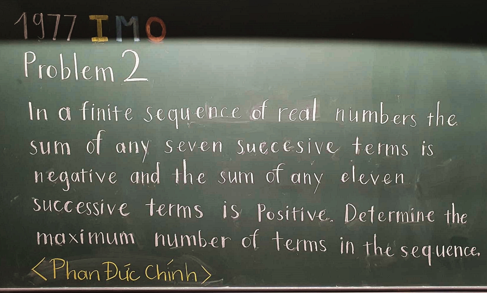 Cho một dãy hữu hạn các số thực,tổng của 7 số hạng liên tiếp luôn là số âm và tổng của 11 số hạng liên tiếp bất kỳ luôn là số dương. Xác định số lượng số hãng tối đa của dãy số để thỏa mãn điều kiện đã cho.