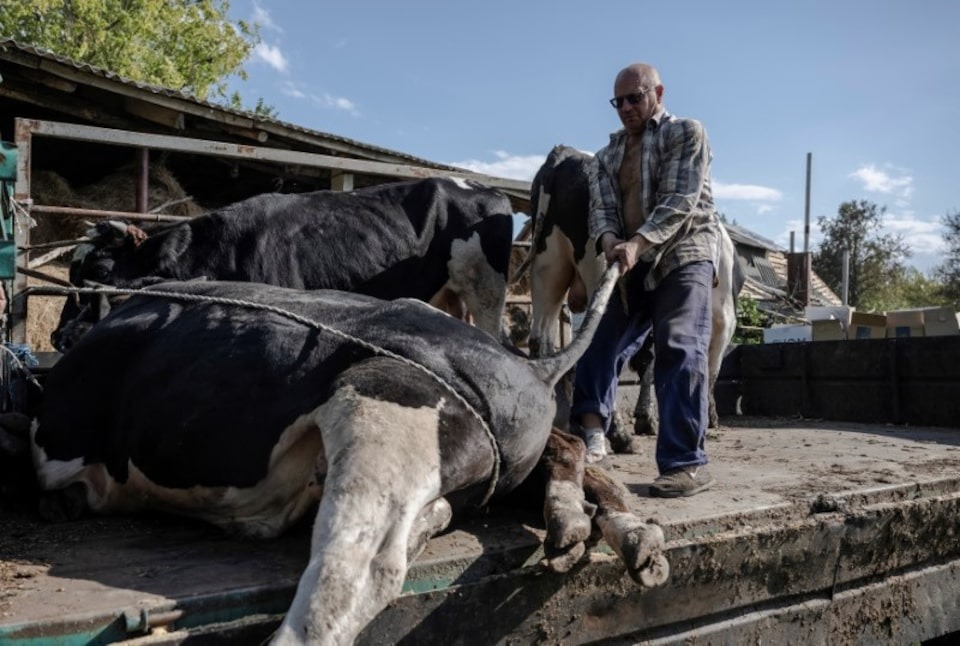 Yurii Maliovanyi,nông dân ở làng Basivka,vùng Sumy,lùa con bò còn sống khỏi khu chuồng trại hôm 11/8. Ảnh: Reuters