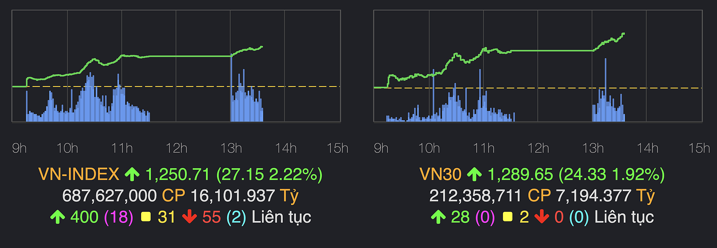 VN-Index tăng hơn 27 điểm ngay đầu giờ chiều khi lực cầu lan tỏa khắp thị trường. Ảnh: VNDirect