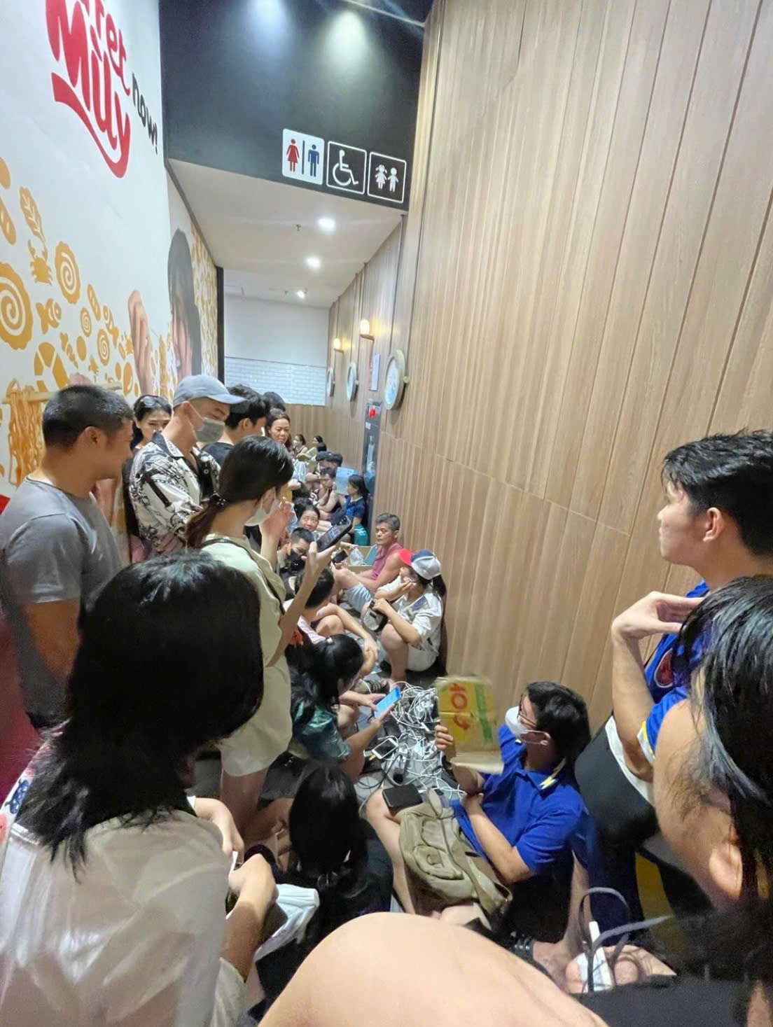 Người dân Hải Phòng ngồi la liệt tại lối vào nhà vệ sinh của trung tâm thương mại Aeon Mall Hải Phòng,quận Lê Chân để sạc điện thoại,chiều 8/9. Ảnh: Duy Anh