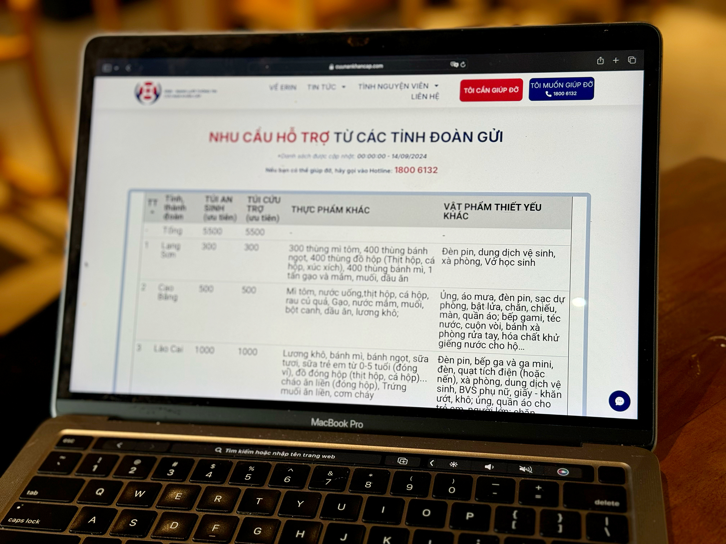 Giao diện website Mạng lưới thông tin cứu nạn khẩn cấp ERIN. Ảnh: Lưu Quý
