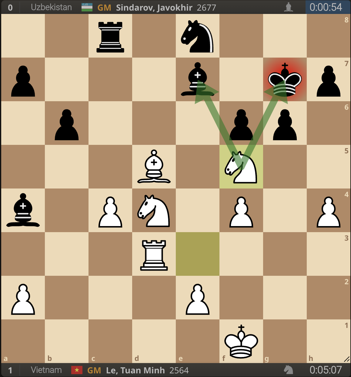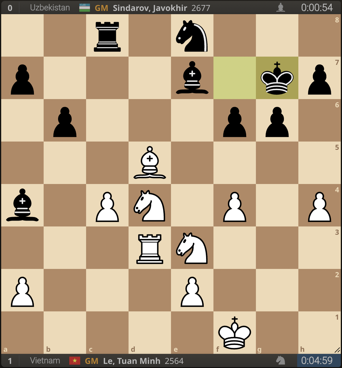 Biên bản ván đấu Lê Tuấn Minh 1-0 Javokhir Sindarov: 1. d4 e6 2. Nf3 c5 3. g3 d5 4. Bg2 Nc6 5. O-O Nf6 6. c4 dxc4 7. dxc5 Qxd1 8. Rxd1 Bxc5 9. Nbd2 c3 10. bxc3 O-O 11. Nb3 Be7 12. c4 Bd7 13. Bb2 Rfd8 14. Nfd4 Rac8 15. Nb5 e5 16. Rac1 Ne8 17. h4 f6 18. Nc3 Bg4 19. Kf1 Rxd1+ 20. Rxd1 Be6 21. Nd5 Bf8 22. Rc1 Kf7 23. f4 b6 24. Ne3 exf4 25. gxf4 Ne7 26. Nd4 Bd7 27. Ba3 Nc7 28. Rd1 Ba4 29. Rd3 g6 30. Bd6 Ne8 31. Bxe7 Bxe7 32. Bd5+ Kg7 33. Nef5+ 1-0