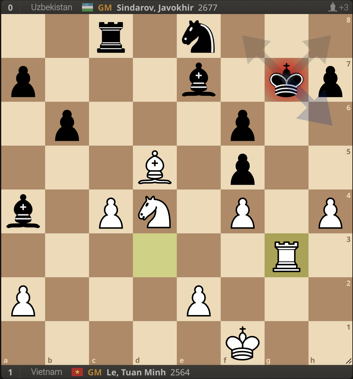 Thế cờ sau 34.Rg3. Vua đen chỉ có ba đường chạy,trong đó hai đường về hàng 8 đều sẽ bị chiếu hết với 35.Rg8. Còn nếu vua đen chạy lên h6,Lê Tuấn Minh có thể dùng mã bắt tốt f5 chiếu,buộc vua chỉ còn cách chạy lên h5. Sau đó,Trắng sẽ chiếu hết với nước 36.Bf7 hoặc Bf3.