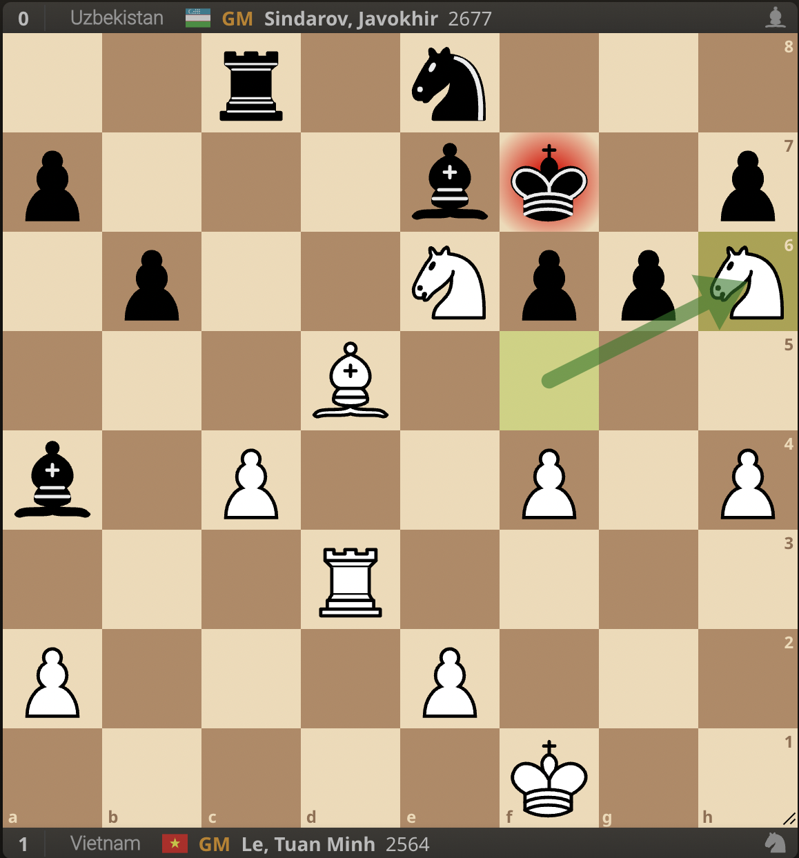 Thế cờ sau 34.Ne6. Vua đen chỉ có hai đường chạy là sang g8 hoặc lên f7. Nếu Vua sang g8,Sindarov sẽ mất tượng e7 lẫn xe c8. Còn nếu Vua đen lên f7,Trắng sẽ thắng bằng cách nào?